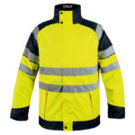 - Parka/veste de pluie haute visibilité, capuche amovible et doublée avec une visière renforcée (capuche skipper) , Col et poches doublés, manches préformées